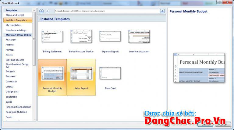 Đôi khi bạn có một loại bảng tính mới và không biết thiết kế nó như thế nào. Không sao cả, Excel cung cấp cho bạn nhiều mẫu (templates) có sẵn để sử dụng, tất cả mọi thứ từ lịch đến sổ cái, hóa đơn, biên lai và nhiều nhiều nữa. . . bạn chỉ việc chọn đúng chủ đề bạn đang cần là được, nếu chưa có mẫu đó bạn có thể chọn chức năng download mới từ Microsoft.