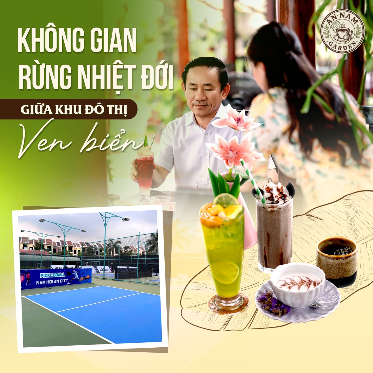Ở đây, bạn có thể vừa nghe tiếng vợt Pickleball vang nhẹ, vừa cảm nhận hương cà phê thoang thoảng trong không khí. Mọi chi tiết đều được thiết kế để khách hàng cảm thấy gần gũi, tươi mới và đầy năng lượng.