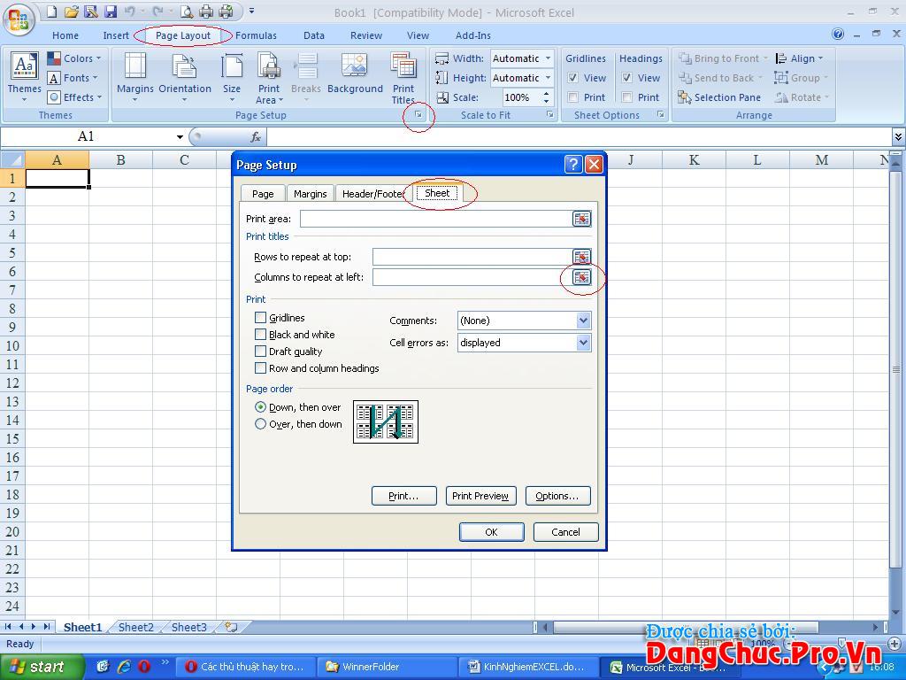 Vào Tab “Page Layout” -> “Page Setup” -> “Sheet” ->